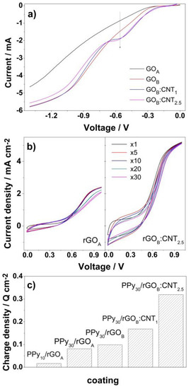 Cathodic scans of GO-modified substrates (V vs. Ag/AgCl) (a); voltammogram evolution for polypyrrole (PPy) electrodeposition with substrate and number of cycles (V vs. Ag/AgCl) (b); evolution of PPy deposition charge density as a function of loading cycle number (10 and 30) onto rGOx:CNTy coatings (c).