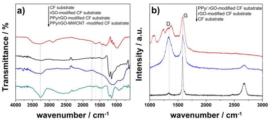 The structure of composite coatings was analyzed by FTIR measurements, as depicted in Figure 2a. Despite low intensity of the peaks, the presence of rGO coating at the surface of CF substrate is indicated by the peaks located at 1720 cm−1 attributed to carbonyl/carboxyl C=O [47], 1629 cm−1 attributed to skeletal vibration of unoxidized graphitic domains (aromatic C=C) [48,49], 1438 cm−1 assigned to epoxy C–O, 1211 and 1152 cm−1 assigned to alkoxy C–O [50], and 1058 cm−1 attributed to carboxyl C–O groups [51,52]. The electropolymerization of pyrrole at the surface of rGO-modified substrate was indicated by the FTIR peak located at 1090 cm−1 which is attributed to the N–H in-plane deformation vibration and 1602 cm−1 assigned to vibrations of C=C in the PPy rings. At the same time, the polymerization of pyrrole is indicated by the peaks at 898 and 796 cm−1 [19,20]. Upon addition of MWCNTs to the rGO coating, the pyrrole presence is indicated by more intense peaks such as that located at 919 cm−1 or those ascribed to C–C and C–N stretching in the pyrrole ring and located at 1410 and 1520 cm−1 or the wide band at 3260 cm−1 attributed to N–H stretching vibration [53]. Although the bands for rGO and MWCNTs are weak in the composite coating and they may be overlapped with PPy [8], the typical FTIR characteristics are present for all components, thus confirming the fabrication of the composite coating.