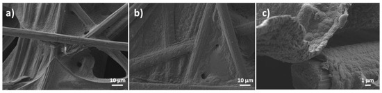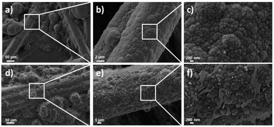The morphology analysis revealed a network of carbon fibers randomly ordered for the activated CF substrate, as depicted in Figure 3a [1]. A continuous compact coating with globular microstructure, typical for the PPy [10] was obtained upon modification of CF substrate with the composite—see Figure 3b,c, in agreement with other studies on PPy electrosynthesis by CV methods [18]. The FESEM images were processed and resulted that PPy layer was deposited in about 500 nm thickness to maintain the porous network of the substrate.