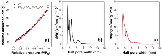 The nitrogen adsorption isotherms and corresponding pore size distribution curves for the modified CF electrodes are further shown in Figure 4. The activated CF substrate exhibits a BET surface area of 35.67 m2 g−1 which increased upon modification with composite coatings, in agreement with other reports [1]. The composite with highest BET surface was the one with higher loading, namely PPy30/rGOB:MWCNT2.5, which exhibited a BET surface area of 103.0 m2 g−1. The half pore width distribution calculated by DFT method is shown in Figure 4b,c and indicates a half pore width of about 2.2 nm for PPy30/rGO(B):MWCNT2.5-coated CF substrate [59].