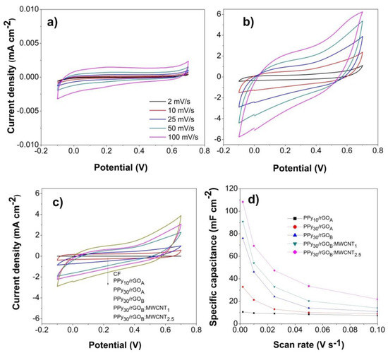 Cyclic voltammograms (CV) (V vs. Ag/AgCl) for CF substrate (a) and PPy30/rGO(B):CNT2.5-modified one (b) with the scan rate (c); CV comparison for the modified substrates at 5 mV s−1 and (d) areal capacitance as a function of scan rate.