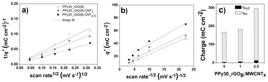 The hierarchical network produced between PPy and nanocarbons is considered for the improved electrolyte ion transport [1,16]. Moreover, the capacitive behavior was found to originate from both surface-controlled and diffusion-controlled counterparts, one resulting from outer electrochemical surface in direct contact with the electrolyte and the other related to the internal region of pores, dislocations, grain boundaries [62,63]. Thus, the Trasatti plots depicted in Figure 6 were employed to find the total charge (Figure 6a) and the outer charge (Figure 6b). The inner contribution to stored charge is then calculated from total and outer charge components and represented in Figure 6c.