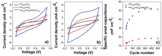 Evolution of CV (V vs. Ag/AgCl) curves of PPy30/rGOA, PPy30/rGOB and PPy30/rGOB:CNT2.5 with cycling at 50 mV s−1: First cycle (a), 500th cycle (b) and areal capacitance as function of cycle number (c).