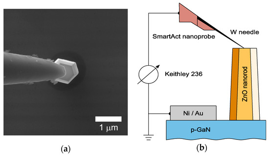 The morphology of the ZnO nanorods was observed by scanning electron microscopy (SEM) (Lyra 3 GM FIB/SEM, TESCAN, Brno, Czech Republic) while the interface between the GaN substrate and the ZnO nanorods was studied by transmission electron microscopy (TEM) (2200FS HRTEM, JEOL Ltd., Tokyo, Japan). The I–V characteristics of the nanoscale heterojunctions formed by a single ZnO nanorod on GaN substrate were measured in the SEM chamber (Figure 2). The samples were stored in the SEM chamber for several hours before the measurements to reduce the impact of persistent photoconductivity on the electrical properties of ZnO nanorod/GaN heterostructures [29]. A tungsten needle of a SmarAct nanoprobe served as a top ohmic contact. The tip of the needle was first cleaned using the focused ion beam to remove the native tungsten oxide to provide reproducible I–V measurements. The bottom ohmic contact was deposited on the cleaned GaN substrate by vacuum evaporation of a 50 nm layer of Ni covered with a 40 nm layer of Au with subsequent annealing at 500 °C for 1 h in nitrogen. The I–V characteristics were measured by applying a linear voltage sweep to the top needle contact while the bottom contact was grounded. Within this paper when a negative voltage is applied to the top contact, the p-n junction between the n-ZnO nanorod and p-GaN substrate is further considered as forward biased and vice versa.