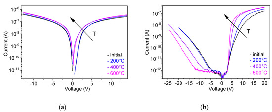 Despite the fact that the I–V characteristics were significantly improved by FIB patterning of the substrate, the issue of a high concentration of defects in solution grown ZnO nanorods remained. To suppress defect-states-mediated leakage through the p-n junction interface, thermal annealing was performed in nitrogen at different temperatures. The annealing at 200 °C had only minor influence on the I–V characteristics, which is in accordance with previous reports that suggested temperatures higher than 300 °C to anneal defects in ZnO and to desorb surface species [46]. After annealing at 400 °C and 600 °C, the conductivity of the plain structures was moderately increased (Figure 5a). The moderate increase is related to increased concentration of free carriers caused by desorption of surface species [38]. However, narrowing of the surface depletion region enhances the surface leakage current along the edge of the interface. The deviation of the semi-logarithmic forward I–V characteristic from linearity and the decrease of the slope is a result of the additional leakage path that bypasses the p-n heterojunction. On FIB-patterned structures, the annealing strongly suppresses the defect-mediated leakage, which is confirmed by both increased slope of the semi-logarithmic forward I–V characteristic and increased the absolute value of the breakdown voltage at the reverse bias (|Vbr| = 12 V after annealing at 600 °C) (Figure 5b).