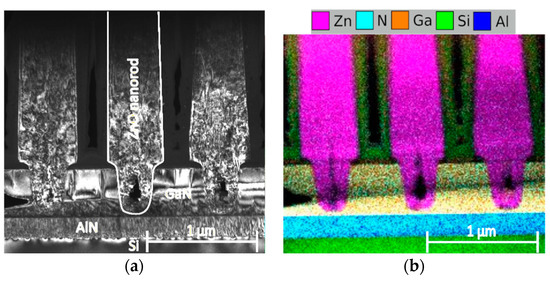 (a) TEM image of the interface between the ZnO nanorod and GaN substrate; (b) Energy-dispersive X-ray Spectroscopy analysis (EDX) of the interface between the ZnO nanorods and the GaN substrate.