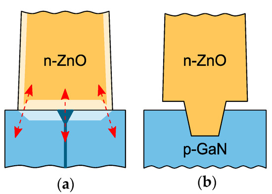 The configurations of both plain and patterned interfaces should be carefully considered to answer the question why the rectifying I–V characteristics are observed only on the patterned substrates. On the plain substrates, an axial ZnO/GaN heterointerface is formed (Figure 7a). The nucleation of ZnO crystallites starts randomly at several sites on the GaN substrate, which leads to nonhomogeneous ZnO/GaN interface. Symmetrical I–V characteristics of the plain structures are related to the large reverse bias leakage current caused by the tunneling through a thin barrier along the perimeter of axial interface [17,33]. Moreover, dislocations into GaN layer were reported as the nucleation sites for the growth of ZnO on GaN substrates [43]. These dislocations can strongly enhance the leakage current in GaN [44]. For the FIB-patterned substrate, the radial ZnO/GaN heterointerface is localized within the trench in the GaN substrate. The bottom edge of the ZnO nanorod is isolated from the GaN substrate because of the lateral overgrowth of ZnO over the PMMA mask and consequently the surface leakage is suppressed (Figure 7b).