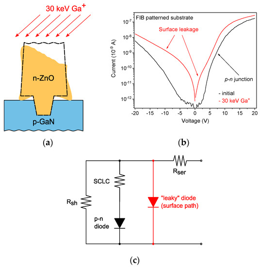 Another confirmation of the key impact of the surface leakage on the I–V characteristics was obtained by FIB milling of the apex of the ZnO nanorods, which was originally performed with the aim to improve the top ohmic contact to ZnO. The surface conductive path was unintentionally restored by redeposition of ZnO sputtered by FIB (Figure 8a). As a result, the I–V characteristics became more symmetrical with both a large reverse bias leakage current and a decreased slope of the linear part of the semi-logarithmic forward I–V characteristic (Figure 8b). This behavior was attributed to a leaky diode in series with the p-n junction (Figure 8c) [45].