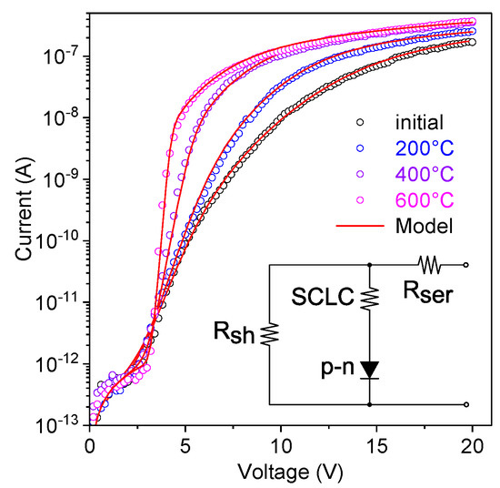 To analyze the impact of annealing on the single nanorod-based heterojunction, theoretical modeling of the forward I–V characteristic was performed (Figure 9). The proposed model takes into account: (i) charge transport through the p-n heterojunction interface (the diode element in the equivalent circuit); (ii) the current flowing through the space charge region of the ZnO nanorod (SCLC resistor the equivalent circuit); (iii) the leakage current that bypasses the junction region; (iv) the resistance of the contacts and neutral regions of semiconductors (Rser resistor the equivalent circuit).