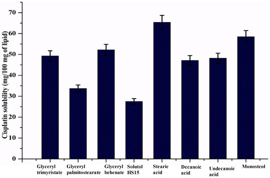 The solubility of cisplatin in different lipids was assessed with slight alterations according to previously reported techniques (w/w with respect to lipid mass) [31]. The more commonly used lipids were glyceryl trimyristate, glyceryl palmitostearate, glyceryl behenate, Solutol HS 15, stearic acid, decanoic acid, undecanoic acid, myristic acid, and Monosteol. The blend of lipid and cisplatin was melted at 80 °C and smeared on a glass slide to observe the presence or absence of insoluble drug crystals under a Leica microscope. Then, the physical mixture was completely dissolved in ethanol to determine the concentration of cisplatin using a UV-visible spectrophotometer (UV-1800, Shimadzu, Kyoto, Japan) at 307 nm [32]. The measurements of the solubility were performed in triplicate. The graph of the solubility studies is represented in Figure 1. Based on the maximum solubility of cisplatin in lipid, we selected lipid for the preparation of SLNs. Results showed that cisplatin has more solubility affinity in stearic acid compared to other lipids. Hence, we selected stearic acid for further preparation of cisplatin-loaded SLNs.
