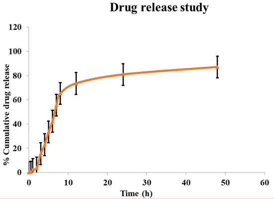 An in vitro drug release study was conducted for 48 h. The dialysis bag method was applied to calculate the amount of cisplatin produced from the SLNs. This is the most commonly used technique for estimating drug releases from SLNs reported in the literature. For the prepared formulations, a biphasic release profile was noted as shown by the first burst within 3 h followed by a prolonged release. Through two distinct processes, dissolution and diffusion, cisplatin loaded into the SLNs’ core leached gradually. Cisplatin’s initial burst release can be attributed to the drug’s rapid release incorporated into the shell. The drug release from the SLNs was anticipated to be very slow due to the strong core at body temperature. Figure 4 demonstrates the release profile of cisplatin prepared by methods supported by one-pot microwave. About 80% cisplatin was released within 12 h from the SLNs generated using the microwave-assisted novel method. These findings suggest that cisplatin incorporated in the SLNs is likely to remain associated with the nanoparticle.