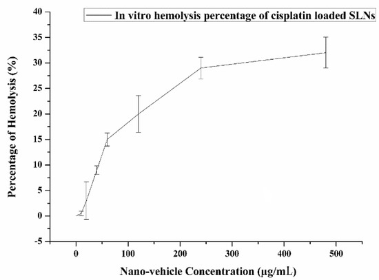 The hemolytic characteristics of cisplatin during chemotherapy are also accountable for the greater risk of blood disorders such as anemia. The assessment of SLNs hemo-compatibility should be regarded as one of the variables for evaluating systemic toxicity. The current findings show that cisplatin-loaded SLNs did not induce hemolysis. The current findings suggest that the percentage of hemolysis following cisplatin-loaded SLNs therapy was smaller relative to plain cisplatin therapy. The present research shows that there was no important difference in the proportion of hemolysis, suggesting that the formulations had no effect on circulating blood cells or on their production. These preliminary findings state that cisplatin loaded in SLNs can be used instead of free cisplatin for cancer treatment to minimize potential side effects. The in vitro hemolysis percentage of cisplatin-loaded SLNs is shown in Figure 5.