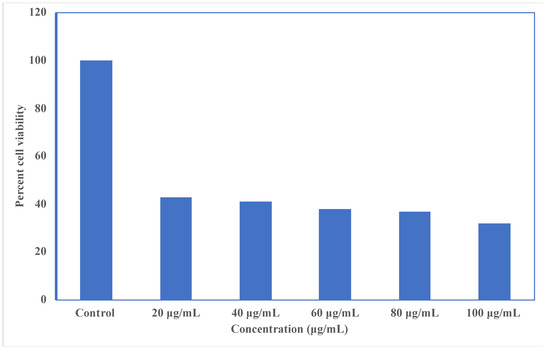 MCF-7 breast cancer cell lines were used to carry out the cytotoxicity study. Briefly, 96-well plates with 5000 cells/well of MCF-7 were taken, then, kept the cell lines to grow for 24 h. After completion of 24 h, in 96-well microtiter plates, 100 μL of cells were inoculated at plating densities depending on the developmental characteristics of each cell, and then were incubated at 37 °C for 24 h in a 5% CO2 incubator. After 24 h of cell incubation, cells were further treated with different concentrations of cisplatin-loaded SLNs, and were kept for 48 h at 37 °C. After 48 h, supernatant was removed and washed with 200 μL of phosphate-buffered saline (PBS). It was then substituted by addition of 200 μL of medium (DMEM for cancer cells) and 30 μL of 5 mg/mL of MTT. The plates were incubated at 37 °C for 4 h. The supernatant was removed from cell incubation and 50 μL of dimethyl sulfoxide (DMSO) was added. A microplate reader was used to evaluate MTT study at 570 nm wavelength and 630 nm reference wavelength. Experiments were performed in triplicate. IC50 values were determined from in vitro dose-response curves using linear regression analysis [36]. The data were analyzed using GraphPad Prism 5.0 (San Diego, CA, USA) and expressed as mean ± standard deviation. The percentage cell viability was calculated using Equation (3):