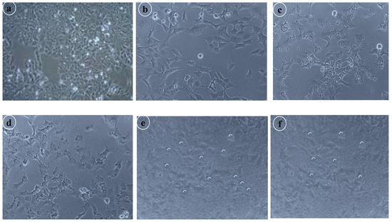 Morphological changes of the human breast cancer cell line MCF-7 after given treatment; (a) Control; (b) 20 μg/mL of cisplatin-SLNs; (c) 40 μg/mL of cisplatin-SLNs; (d) 60 μg/mL of cisplatin-SLNs; (e) 80 μg/mL of cisplatin-SLNs; (f) 100 μg/mL of cisplatin-SLNs.