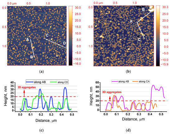 AFM images (1.54 × 1.54 μm2) of the Si wafer surface of (a) S30 and (b) S30/20 with corresponding profiles of cross-sections along A–B, CA shown in (c) and along A–B–C shown in (d). Each single round spot with a similar color profile corresponds to a single AuNP, while not-uniform objects or the ones with brighter contrast correspond to AuNP aggregates.