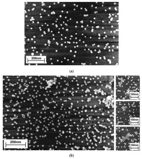 Thus, using APTES is the most straightforward approach for the immobilization of AuNPs on a large area. However, obtaining a coating with only single AuNPs well separated from each other is rather difficult to achieve because of the intrinsic presence of self-aggregated AuNPs. Their appearance is associated with the quality of the APTES coating [19]. The smoother the aminosilane monolayer is at the molecular scale, the lower will be the amount of aggregated AuNPs. Several approaches have been proposed to improve the quality of the APTES coating. At first, the substrate roughness has to be minimized [33,34]. Then, the surface density of the OH– terminal groups has to be sufficiently enhanced to be able to bind all three ethoxy groups of the APTES molecules. Then the optimal concentration of the APTES has to be used, and a suitable time of a substrate immersion has to be chosen [33]. Even with all of these steps, some ethoxy groups of the APTES can remain not completely linked to the surface. This can be improved partially by elevating the APTES solution temperature to ~70 °C during substrate silanization [35] or by post-annealing of the APTES-coated substrate at T = 600 °C in vacuum [19]. However, even with these treatments, finding the majority of the –NH2 groups of the APTES monolayer pointing away from the surface is difficult to achieve [36] and, thus, completely suppressing self-aggregation of AuNPs is impossible.