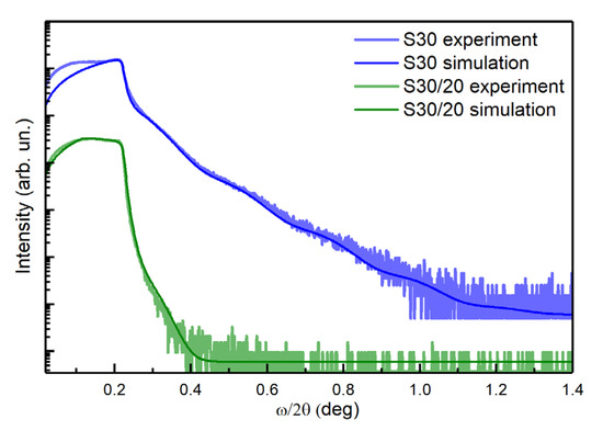 The XRR data obtained for sample S30 with the inclusion of a small number of self-aggregated AuNPs and for sample S30/20. The experimental data were fitted with the X′Pert Reflectivity software package based on the Parratt formalism [45].