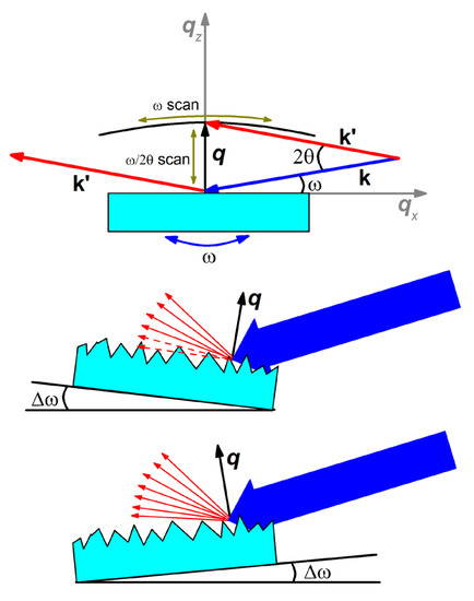 The specular XRR profile (Figure 3) corresponded to the line on the RSM along the direction, for . The diffuse scattering components () were attributed to the roughness and to the lateral and vertical correlation lengths. A series of / XRR scans at different incidence angles of X-rays was measured.