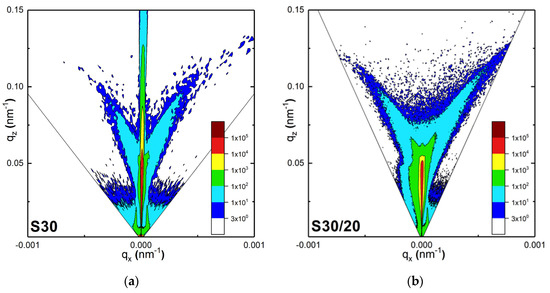 A significant contribution of the specular scattering component, manifested by a relatively high intensity along the direction at , was observed for S30. This confirms our above observations about the low surface roughness of S30. For S30/20, practically all the incident intensities were scattered without a specular contribution to the RSM. Almost the entire intensity of the incident X-ray irradiation was scattered off surface inhomogeneities. This fact and the asymmetry of the diffuse scattering (Figure 5b) evidenced the presence of enhanced roughness in S30/20. Thus, the RSM indicated the absence of a vertical correlation of the roughness profiles [46], which suggested that all 3D objects in S30/20, including dimers and larger aggregates of AuNPs, were randomly distributed on the surface and did not have any particular orientation with respect to the surface.