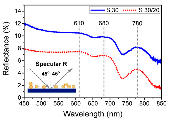 Optical reflectance spectra for sample S30 (solid blue curve) and S30/20 (red dotted curve). The incidence angle was 45°.