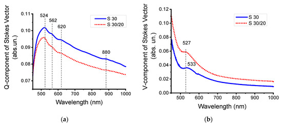The Q-component takes into account the simultaneous interaction with s- and p-polarized electromagnetic radiation. The Q-component is determined by the linear (amplitude) anisotropy since it is equal to the difference between the reflectance of Rs and Rp. The decrease of the spectral amplitude of Q(λ) for S30/20 was related to an increase of nanoparticle concentration and a resonance interaction with electromagnetic radiation [42,64] (Figure 8a).