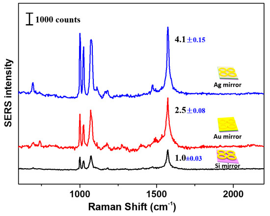 SERS intensities of benzenethiol molecules at monolayered Au nanorings deposited on Si (black trace), Au (red trace), and Ag (blue trace) mirrored substrates.