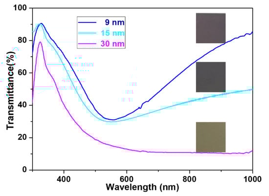 Transmittance of Ag covers immobilized on glass slides with different thicknesses. The squares on the right panel of the figure show photographs of corresponding Ag covers with different thicknesses.