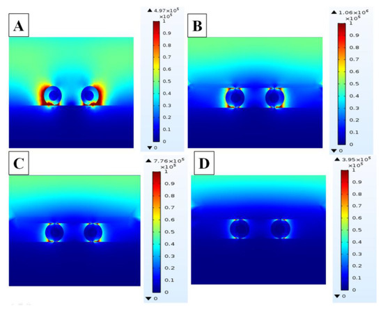 FDTD simulation of electromagnetic field distribution of sandwiched films under the radiation of 633 nm laser: (A) Ag mirror/Au nanorings and (B–D) Ag mirror/Au nanorings/Ag cover with different cover thicknesses of 9 nm, 15 nm, and 30 nm.