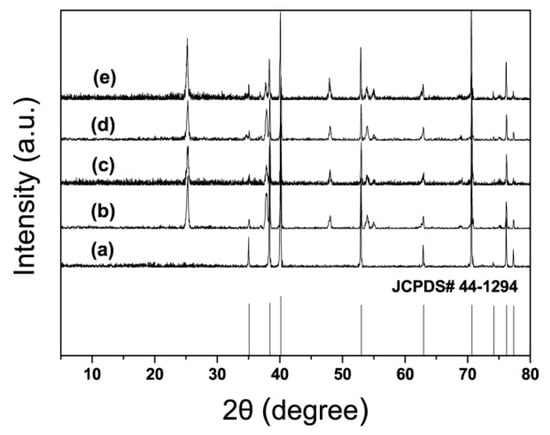 The XRD patterns of Ti foil, bare TiO2NTs, and the modified TiO2NTs/Ti are shown in Figure 1. The characteristic peaks of Ti (JCPDS# 44-1294) emerged in all patterns, because Ti foils were substrates. The peaks appearing at 25.28°, 37.80°, 48.05°, 53.89°, 55.06°, 62.69° observed in Figure 1b–e correspond to the diffraction of (101), (004), (200), (105), (211), (204) crystal planes of anatase TiO2 (JCPDS# 21-1272), respectively. However, diffraction peaks of Pt or IrO2 were not observed in the modified electrodes, which should be attributed to their high dispersion and low content.