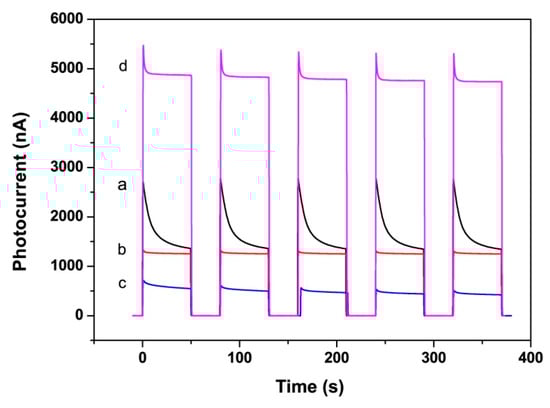 A photocurrent-time curve can be used to characterize the separation effect of photogenerated carriers, and the increase of photocurrent indicates the low recombination probability of photogenerated electron-holes. Figure 4 shows the photocurrent-time curves of different electrodes in 0.1 M PBS solution under 365 nm LED UV light irradiation. From Figure 4a, it can be seen that the photocurrent curve of the bare TiO2NTs electrode had an anodic photocurrent spike at the initial time of irradiation, and then continuously decreased until a constant current was reached. However, the decorated TiO2NTs electrodes could generate stable photocurrent more rapidly under the same condition, as shown in Figure 4b–d.