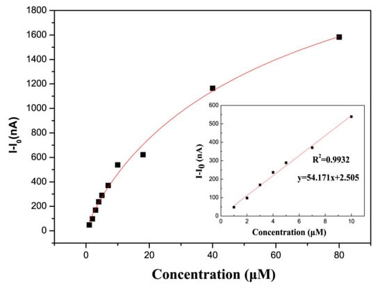 On the basis of photoelectrochemical performance, the application of the fabricated Pt-IrO2/TiO2NTs/Ti for detection of GSH was investigated. The electrode was kept in PBS at +0.3 V bias voltage under UV illumination for 5 min as pretreatment, and then the positive photocurrent was detected in the presence of GSH in PBS. As shown in Figure 5, the photocurrent increased with the addition of GSH under illumination, fitted with the Langmuir curve. The inset presented in Figure 5 shows that the photocurrent response of the Pt-IrO2/TiO2NTs/Ti biosensor was proportional to GSH concentration in the range of 1~10 μM with the regression equation of I-I0(μA) = 2.505 + 54.171CGSH(uM) (R2 = 0.9932) (I represents the photocurrent obtained in the presence of GSH, and I0 is the blank photocurrent). The detection limit (LOD) of the sensor can be obtained from the formula LOD = 3 Sb/S (Sb = standard deviation of blank signal, S = sensitivity), and the calculated value was 0.8 μM.