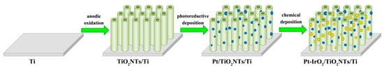 Diverse nanomaterials, such as Au [], ZnO [,], CdS [,], TiO2 [,], and porphyrin [,], have been exploited as electrodes. Among them, TiO2 nanomaterials have been widely investigated due to their high PEC activity, stable performance, good biological compatibility, and obvious surface effect [,,]. TiO2 nanotube arrays can be grown directly on Ti substrates (TiO2NTs/Ti) by anodic oxidation, which are good candidates for PEC electrodes. For such electrodes, Ti substrates have superior performance of electronic conduction, stability, and exhibit excellent compatibility, which enable them to be excellent implantable devices []. In addition, the unique one-dimensional nanostructure of TiO2 nanotube arrays accelerates electron transport and shortens the transfer distance of photogenerated carriers []. The tubular structure of TiO2NTs can also facilitate the high dispersion of modified components and adsorption of aimed biomolecules. However, the application of TiO2 in PEC detection is limited by its wide band gap and fast recombination of photogenerated charges, which can lower the photoenergy conversion efficiency and sensitivity of PEC sensors. A typical method to solve these problems is modification the TiO2 photoelectrode with noble metals [,,] or metal oxides [,]. The presence of noble metal results in the formation of a Schottky barrier at the metal-semiconductor interface, which can reduce the recombination of photogenerated charges and promote the separation of photogenerated charge carriers [,,]. For instance, He’s group prepared Pt particles modified TiO2 film, and the photocurrent of 3 wt% Pt modified TiO2 film under UV irradiation was 1.5 times higher than that of bare TiO2 film []. In contrast to Pt, IrO2 can intercept photogenerated holes from semiconductors and mediate the hole transfer process [,]. The synergistic effect of Pt and IrO2 has been reported by Yuan’s group []. Pt functioned as an electron collector while IrO2 functioned as a hole capture, which may have led to significant charge separation and increased photocatalytic activity.
