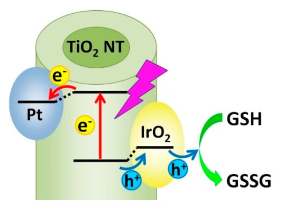 Glutathione (γ-glutamyl-cysteinyl-glycine, GSH), an important tripeptide, plays a major role in many biological functions such as gene expression regulation, cell protection, immune regulation, enzyme activity, and metabolic regulation, etc. [,]. Cellular concentration of GSH is related to a variety of human diseases [,], and the detection of GSH is urgent because of its importance in physiological circumstances. In this paper, Pt and IrO2 nanoparticles were loaded on TiO2NTs/Ti electrodes to form a Pt-IrO2/TiO2NTs/Ti electrode as shown in Scheme 1, leading to a novel PEC biosensing platform, which was then applied for the biodetection of GSH. This biosensor showed good sensing performance of GSH with a rapid response. The functions of Pt and IrO2 in this system were also explored.
