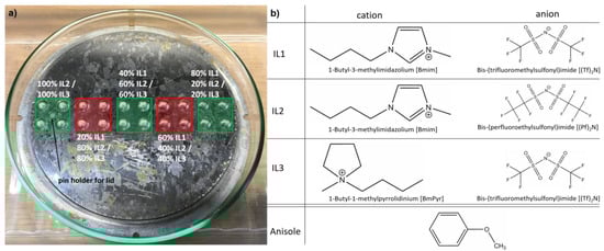(a) Photo of the 20-cavity plate (100 mm diameter). The applied arrangement of ionic liquid (IL) (mixtures) is indicated. IL1 was mixed with IL2 or IL3 respectively in steps of 20 vol.% from pure IL2/IL3 to a mixture of 20 vol.% IL2/IL3 with 80 vol.% IL1 before deposition. Anisole was added in the same volumetric steps to already-sputtered pure Ag in IL1. The chemical structures of the IL ions and anisole are shown in (b). IL2 and IL3 differ only by the anion and cation, respectively, with respect to IL1. The drawings of the chemical structures are not depicted in the same size format (drawn with “ChemDraw Professional” from PerkinElmer).
