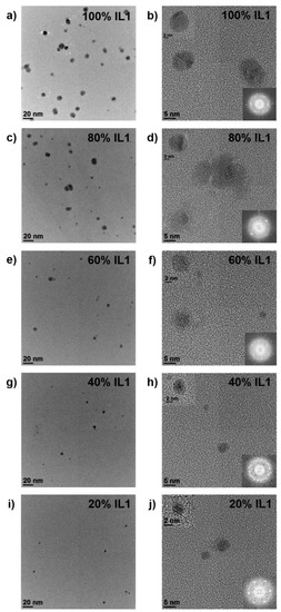 Overview of TEM results of Ag NPs in IL1 diluted with anisole in 20 vol.% steps. Ag NPs in pure IL1 are shown in (a,b). Ag NPs in IL/anisole mixtures of 80 vol.% IL1 and 20 vol.% anisole are shown in (c,d), 60 vol.% IL1 and 40 vol.% anisole in (e,f), 40 vol.% IL1 and 60 vol.% anisole in (g,h), and 20 vol.% IL1 and 80 vol.% anisole are shown in (i,j). Fast Fourier Transformation (FFT) and corresponding high-resolution TEM (HRTEM) images of the NPs are displayed as insets in the small overview images.