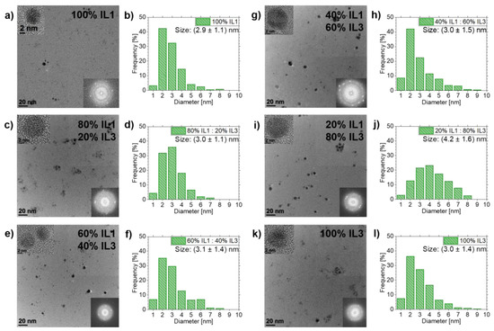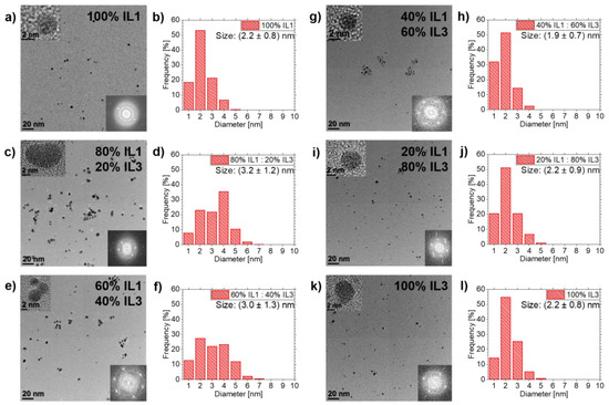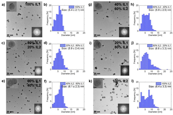 Overview of TEM results of Au NPs sputtered in IL1/IL3-mixtures and pure ILs as references. TEM images and the corresponding NP size distribution are depicted in (a,b) for pure IL1. Overview images and NP size distributions for IL1/IL3-mixtures are shown in (c,d) for 80 vol.% IL1/20 vol.% IL3, in (e,f) for 60 vol.% IL1/40 vol.% IL3, in (g,h) for 40 vol.% IL1/60 vol.% IL3 and in (i,j) for 20 vol.% IL1/80 vol.% IL3. Results of pure IL3 are illustrated in (k,l). HRTEM images of NPs from the particular investigated IL (mixtures) and corresponding FFT images are depicted as insets in the overview images, confirming NP crystallinity due to visible lattice fringes and corresponding spots in the FFTs.