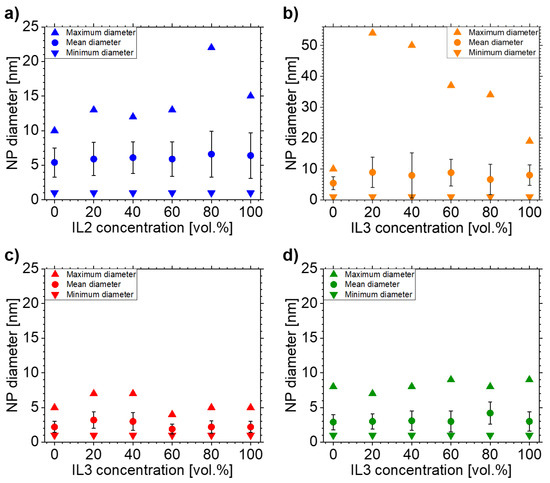 Overview of the different size parameters of all NP/IL-mixture combinations. Minimum and maximum NP diameter as well as the mean diameter of the NPs with error are depicted in (a) for Ag in IL1/IL2-mixtures, in (b) for Ag in IL1/IL3-mixtures, in (c) for Au in IL1/IL3-mixtures and in (d) for Cu in IL1/IL3-mixtures.