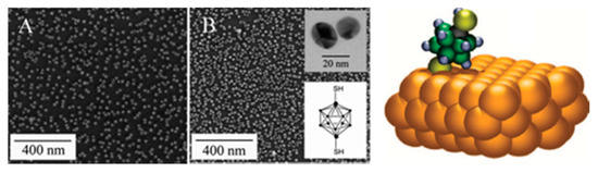 SE TEM images (A,B) of Au-NPs functionalized by the carboranethiol 1,12-(HS)2-1,12-C2B10H10 and the side view of space-filling models of same carboranethiol drawing in the capture on a gold (111) surface. Reproduced with permission from [82], ACS 2008.