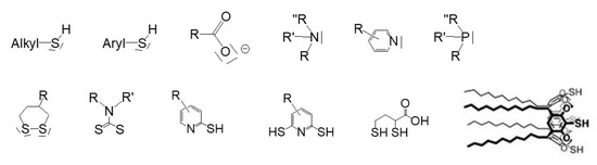 Concerning the stabilization of colloids by steric repulsions, the interaction of the stabilizing agent with the NPs surface is usually ensured by use of electron donating groups. Different anchoring groups have been employed in the literature [17], but the most common ones are, without contest, alkylthiol or arylthiol groups [17] (Scheme 2). The sulfur atom is the element that ensures the strongest interaction with gold atoms. Other functions have also been used to graft a stabilizing agent onto the NPs surface: phosphine [18,19,20,21], amine [22], pyridine [23], and carboxylate [24] (See Scheme 2). To prevent undesired desorption of a stabilizing agent, an efficient method consists of using molecules possessing at least two electron-donating groups, such as disulphide [25], dithiocarbamate functions [26], or trithiol species [27]. Mixed donating groups such as mercaptopyridine, [28] mercaptothiadiazole [29], or lipoic acid derivatives [30] that possess two anchoring groups also efficiently ensure a strong interaction with the NP surface. These polydentate ligands render functionalized NPs effectively more stable towards ligand exchange.