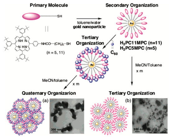 Scheme of nanocomposites based on the association of porphyrins and C60 onto Au-NPs surface. Reproduced with permission from [72], ACS 2003.