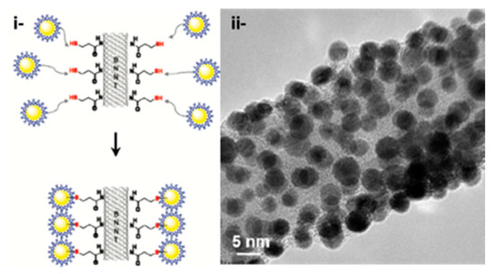 (i) Schematic representation of decorative boron nitride nanotubes, functionalized by thiol pendant groups, by Au-NPs, i- route of synthesis and (ii) corresponding TEM image, reproduced with permission from [105], ACS 2004.