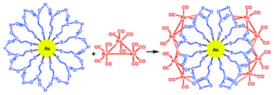 Route of functionalization of Au-NPs by trinuclear ruthenium complexes, reproduced with permission from [145] ACS 2006.
