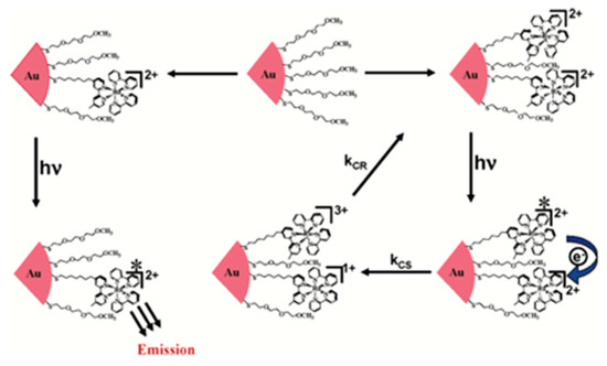 - Pramod, P.; Sudeep, P.K.; Thomas, K.G.; Kamat, P.V. Photochemistry of Ruthenium Tris-bipyridine Functionalized on Gold Nanoparticles. J. Phys. Chem. B 2006, 110, 20737–20741. [Google Scholar] [CrossRef] [PubMed]