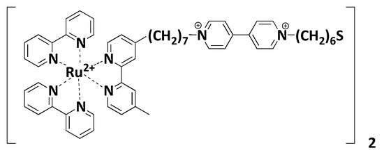 - Kuwahara, Y.; Akiyama, T.; Yamada, S. Construction of gold nanoparticle-ruthenium (II) tris(2,2′-bipyridine) self-assembled multistructures and their photocurrent responses. Thin Solid Films 2001, 393, 273–277. [Google Scholar] [CrossRef]