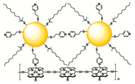 Other developments involving C60 and Au-NPs concern their combinations with γ-cyclodextrines [71] to form network aggregates or with porphyrins to design photovoltaic solar cells (See Scheme 8) [72]. Recently, Au-NPs stabilized with fullerene—offering multiple binding modes [73] or functionalized with fulleropyrrolidine [74]—were reported.