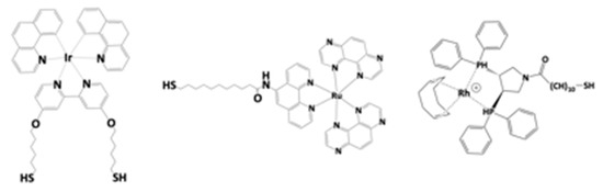 - Belser, T.; Stohr, M.; Pfaltz, A. Immobilization of Rhodium Complexes at Thiolate Monolayers on Gold Surfaces: Catalytic and Structural Studies. J. Am. Chem. Soc. 2005, 127, 8720–8731. [Google Scholar] [CrossRef][Green Version]