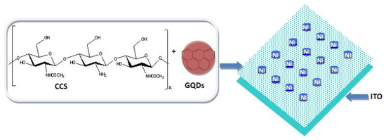 Great efforts to develop biocompatible or biodegradable devices have been made, adopting both organic materials and inorganic materials [13,22]. However, the balance between device performance and biocompatibility or biodegradability has been insufficiently considered. The biodegradability and biocompatibility requirements predominantly impose restrictions on the suitability of conductive materials for complementary metal-oxide−semiconductors (CMOS), such as Pt, Ag, Al, Si, etc. [23]. Therefore, it is crucial to rebuild bioelectronic systems to achieve a trade-off between device performance and biocompatibility. Nevertheless, biomemory devices based on biocompatible materials like protein, cellulose and DNA exhibit binary resistive-switching behavior, with biologically incompatible electrodes like Al, Pt, Au and Ag [24,25,26]. This may hinder the implementation of a practical biomemory system. This paper aims at providing a novel biomemristic device using Ni/CCS:GQDs/indium-tin-oxide (ITO), in which CCS:GQDs nanocomposites serve as passive components; ITO and Ni are used as top and bottom electrodes, respectively. CCS:GQDs nanocomposites are nontoxic, sustainable, and environment-friendly, and, furthermore, ITO and Ni are nontoxic and non-polluting for the environment and can be recycled and reused. The focus is on the charge trapping–detrapping mechanism concerning CCS:GQDs nanocomposites as well, which renders them promising candidates for enabling the biocompatibility and integration of high-performance biomemristic devices.
