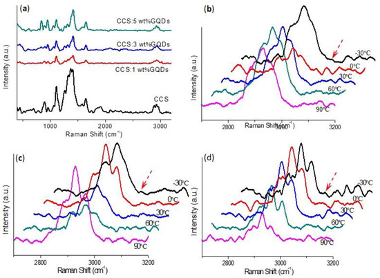 (a) Raman spectra of CCS and its nanocomposites with distinct chemical ratios of GQDs at 25 °C. Temperature dependence of Raman spectra for CCS:GQDs nanocomposites with GQD contents of (b) 1 wt%, (c) 3 wt% and (d) 5 wt%.