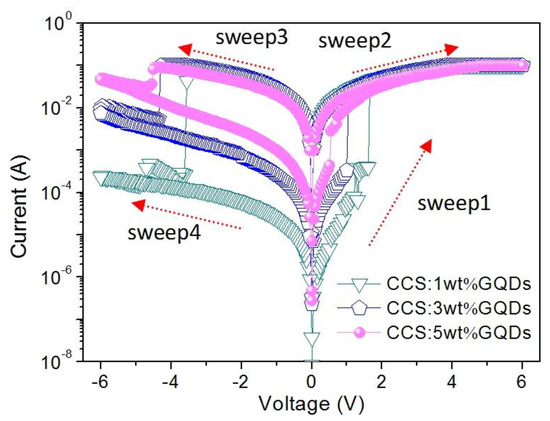 In this work, biomemristic behaviors of Ni/CCS:GQDs/ITO can be observed in Figure 5, in which the compliance current of 0.1 A was set up to avoid permanent electrical breakdown. The arrows in the diagram demonstrate the cyclic scanning directions of the applied biases in turn. For Ni/CCS:1 wt%GQDs/ITO, when a voltage was initially applied from 0 V to 1.6 V (sweep 1), a relatively low current was observed. The corresponding resistance level could be defined as a high resistance state (HRS) or OFF-state. When the sweeping bias exceeded 1.6 V (VSET), a current increase suddenly arose, indicating that the device switched from an HRS to a low resistance state (LRS) or ON-state. This switching corresponded to a “SET” process. Moreover, the device was kept in an LRS even if the applied bias continuously increased up to 6 V. Subsequently, a positive voltage was swept from 0 V to 6 V (sweep 2) once again, indicating that the device still remained stable in an LRS. When the applied bias was continuously scanned from 0 V to the negative voltage VRESET = −3.6 V (sweep 3), the device switched back to HRS. The relative process can be denoted as “RESET”. Then the negative bias was swept from 0 V to −6 V again, when the device was maintained in an LRS (sweep4). An important parameter was the HRS/LRS resistance ratio for binary biomemory applications based on the bistable resistive switching effect. A high HRS/LRS resistance ratio (RHRS/RLRS > 103) was obtained for Ni/CCS:1 wt% GQDs/ITO, which could effectively avoid the error detection in the biomemristic states during the SET and RESET processes.
