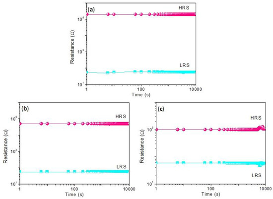 Retention test at a constant voltage of −0.1 V for (a) Ni/CCS:1 wt% GQDs/ITO, (b) Ni/CCS:3 wt% GQDs/ITO and (c) Ni/CCS:5 wt% GQDs/ITO.